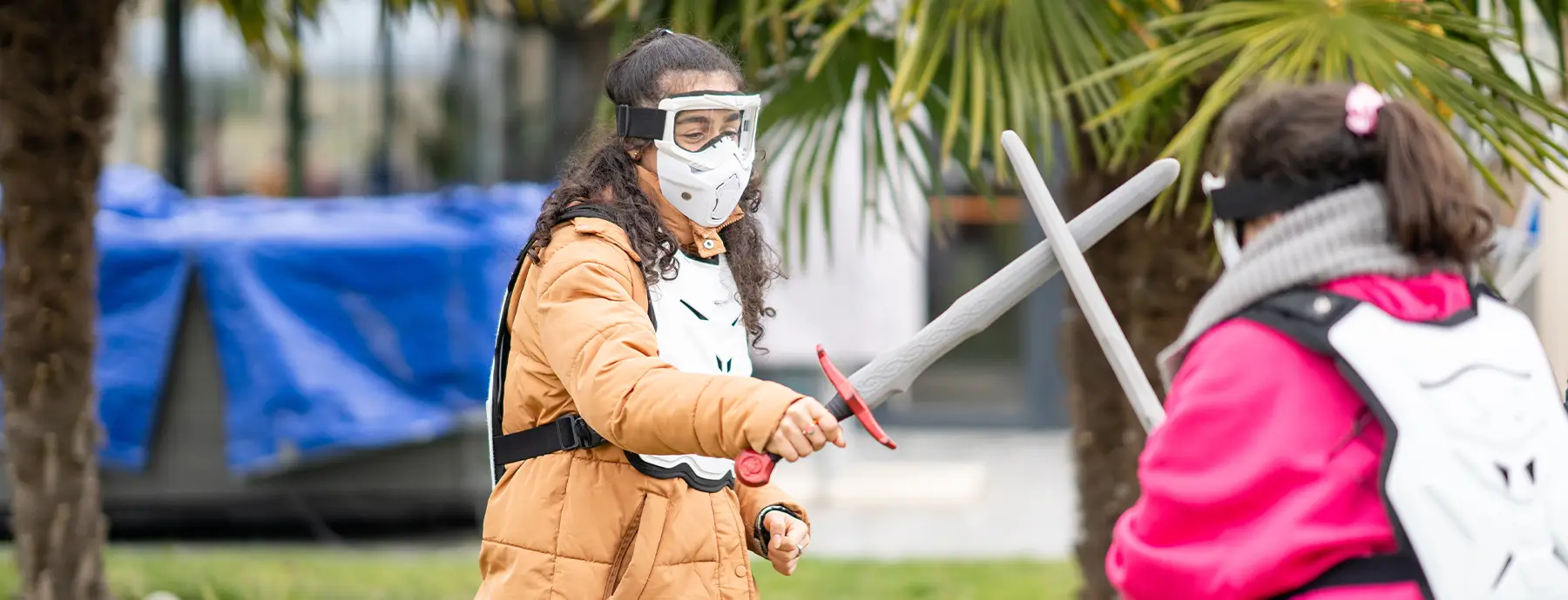 Battle Game peut accueillir jusqu’à 6 joueurs simultanément, répartis en équipes avec des épées, des arcs et des shurikens en mousse.
